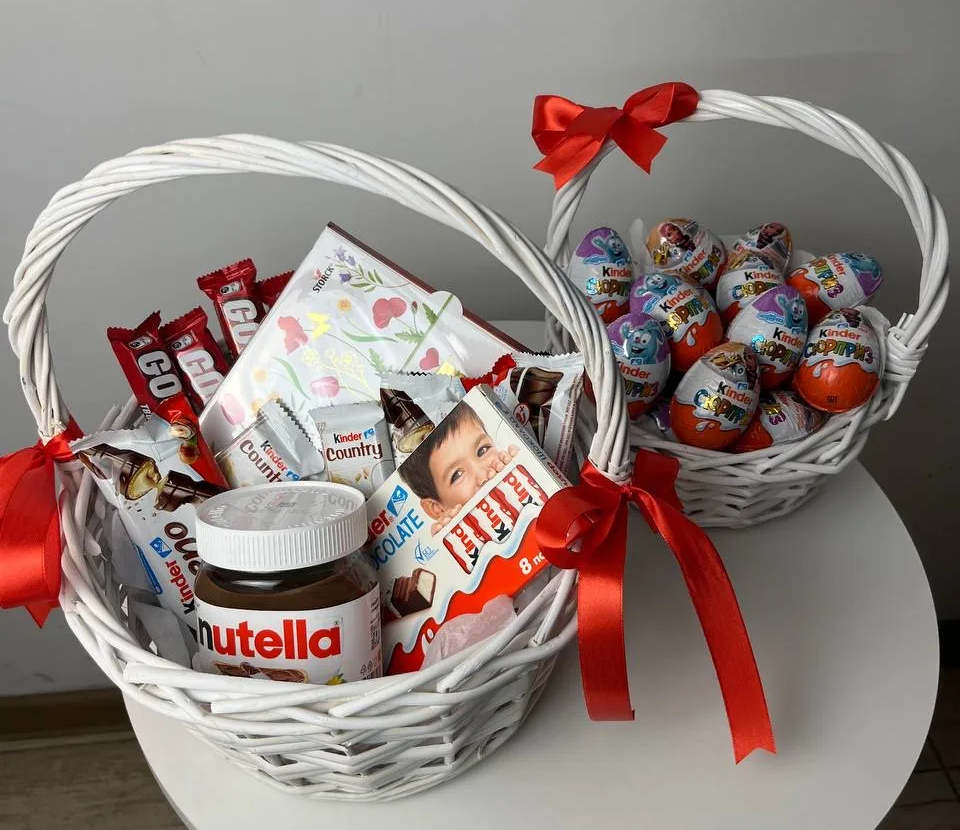 Состав: Nutella банка, Kinder шоколад (100 гр.), Kinder Bueno - 3 шт., Kinder Country - 3 шт., шоколадки -KitKat - 4 шт., коробка конфет., корзина