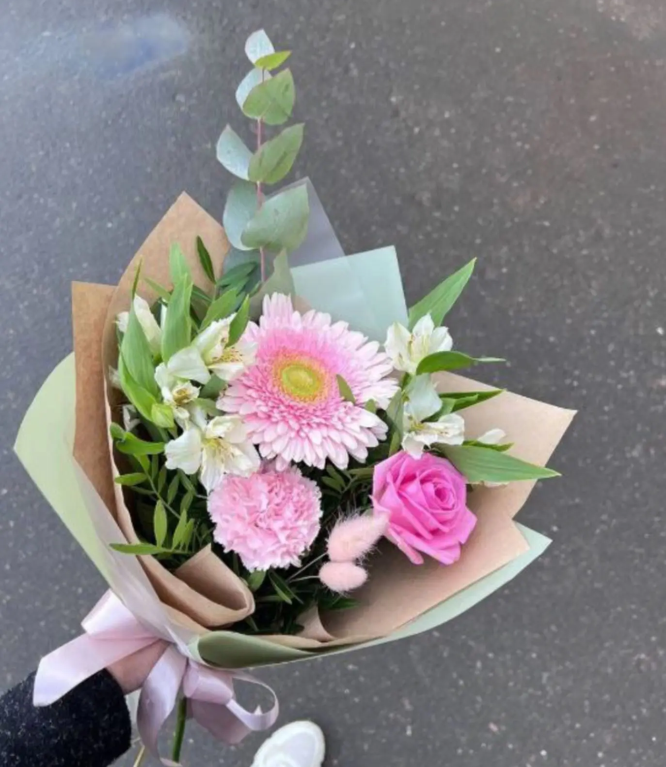 гербера-1шт, роза-1шт,гвоздика-1шт, алстромерия-2шт,зелень, упаковка, лента