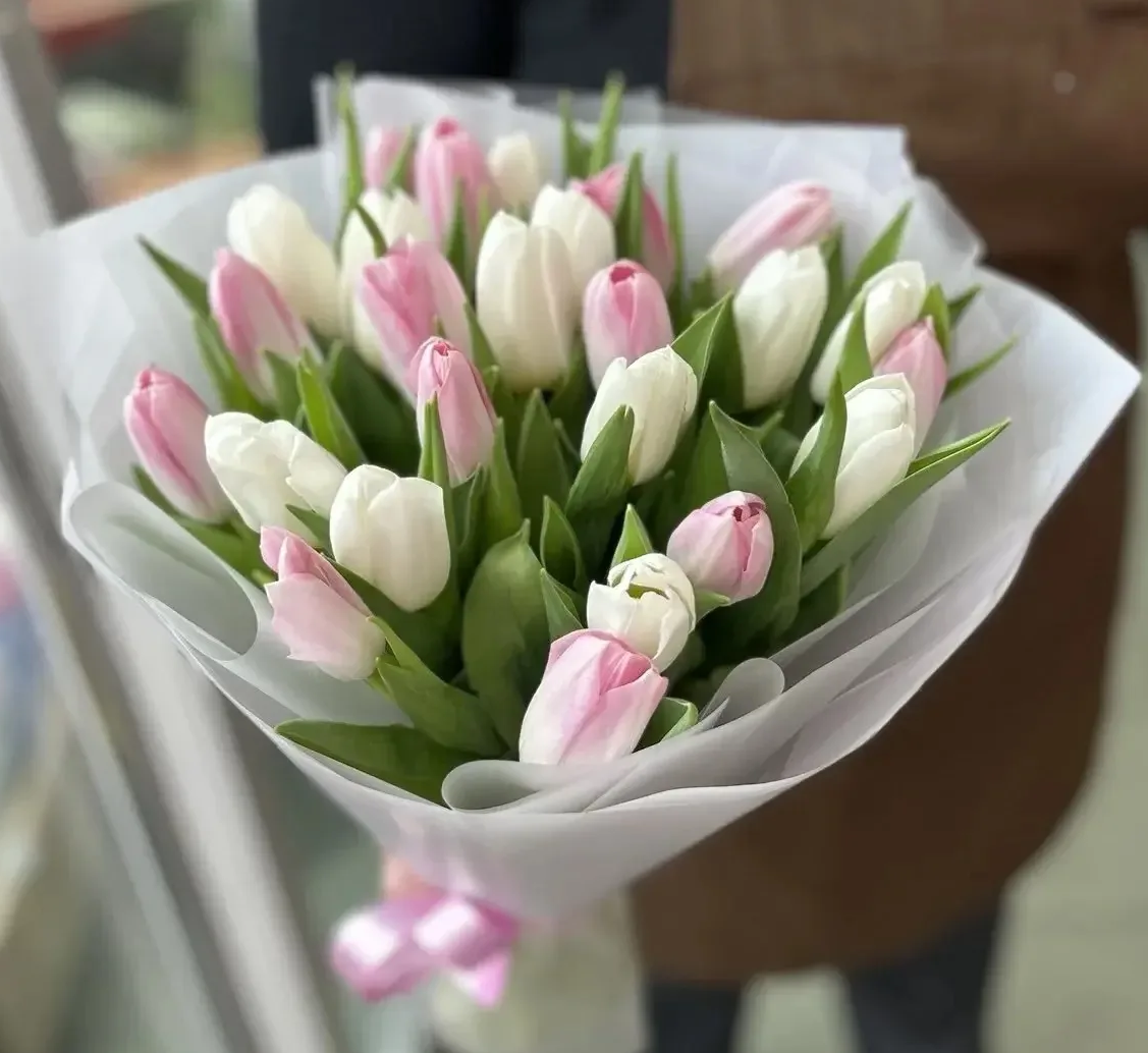 Букет из белых и розовых тюльпанов — это настоящая симфония весенней свежести и изящество