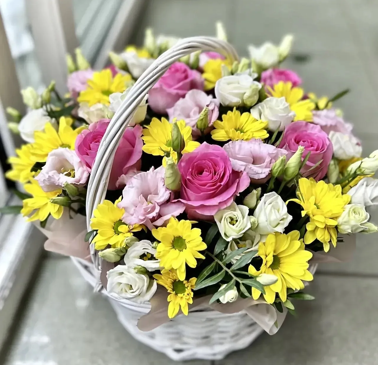 Нежная и гармоничная композиция в стильной корзине, в которой каждая деталь продумана до мелочей. Центральное место занимает изящная розовая роза — символ утончённости и искренних чувств. Её мягкий оттенок красиво дополняют воздушные белые и розовые эустомы, создавая ощущение лёгкости и романтики. Яркий акцент добавляет кустовая ромашковидная жёлтая хризантема, наполняя композицию солнечным теплом и живостью. Такое сочетание цветов выглядит свежо, элегантно и одновременно уютно - идеальный подарок для выражения нежности, заботы и радости.
