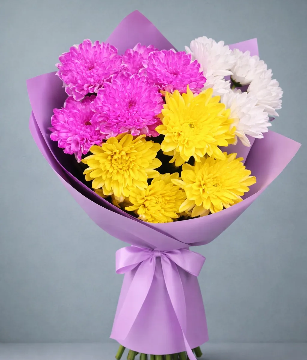 Нежный и жизнерадостный букет, в котором белые, жёлтые и розовые кустовые хризантемы создают гармоничное сочетание лёгкости и ярких акцентов. Пышные соцветия придают композиции объём и воздушность, наполняя её теплом, свежестью и позитивным настроением.