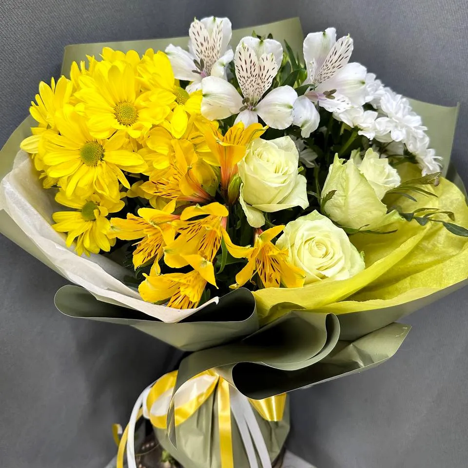 Яркий и восхитительный букет из роз, альстромерий и хризантем в жёлтых тонах — это великолепный подарок, способный поднять настроение и украсить любое мероприятие. Каждое цветочное составляющее этого букета приносит свою уникальную энергетику: нежные розы символизируют любовь и олицетворяют красоту, а яркие альстромерии добавляют свежести и игривости. Хризантемы же с их роскошными формами и насыщенным жёлтым цветом привносят в композицию тепло и радость.