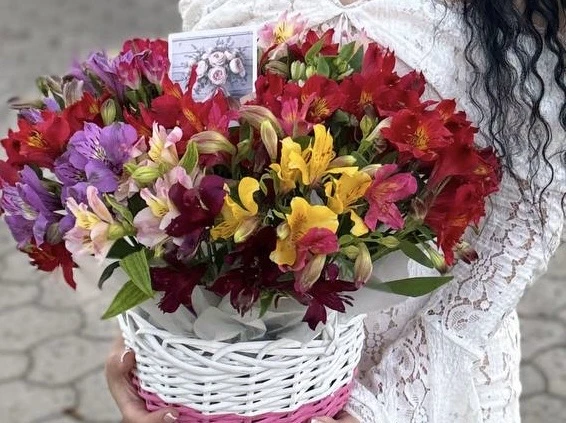 • Премиум - альстромерия - 31 шт., декоративная зелень, оазис, корзина