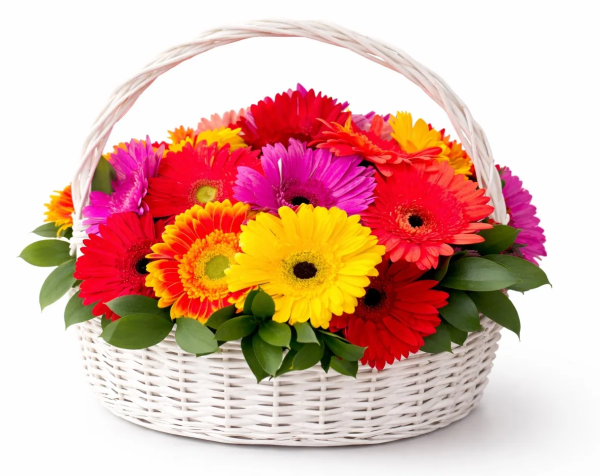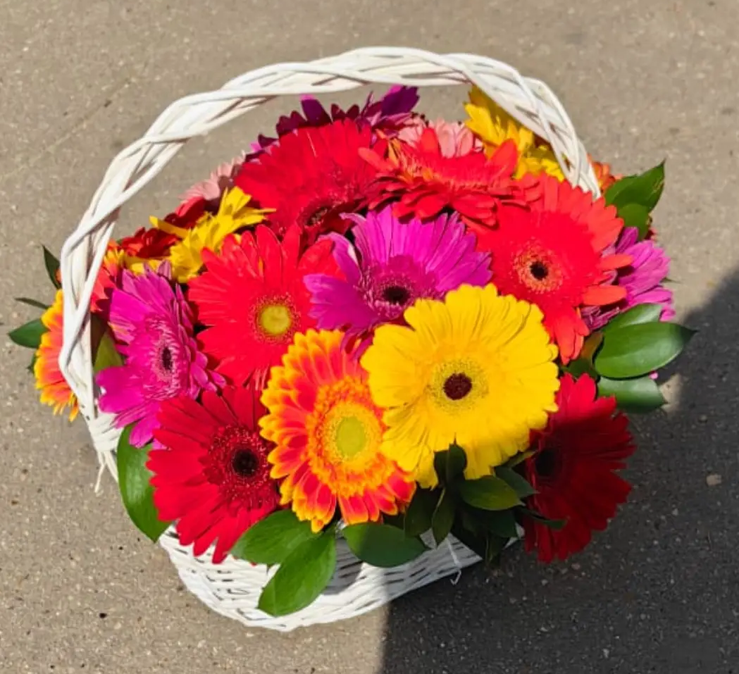 Яркая композиция в корзине из разноцветной герберы - настоящий заряд радости и позитивных эмоций. Идеальный выбор для любого повода.